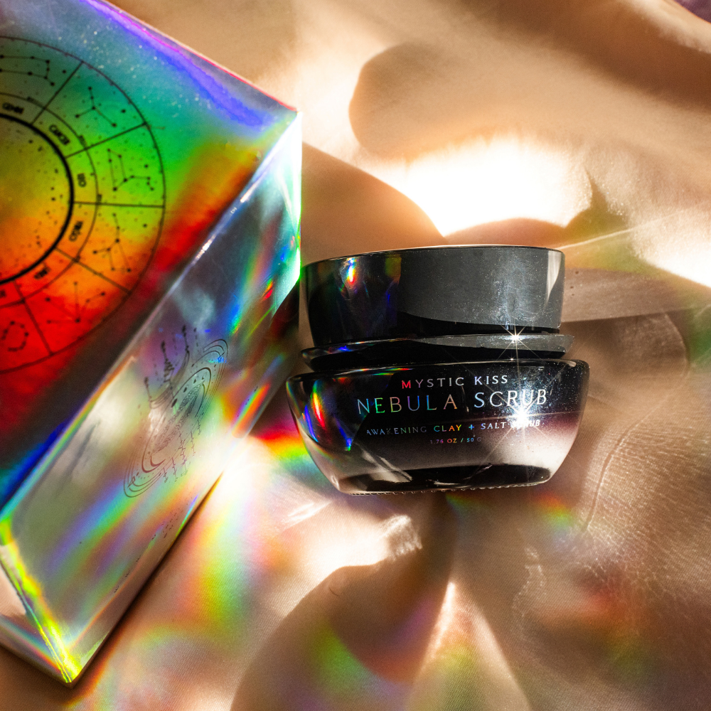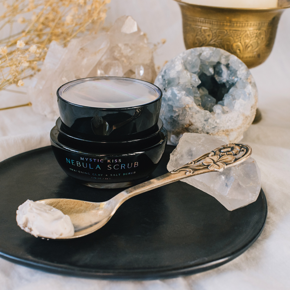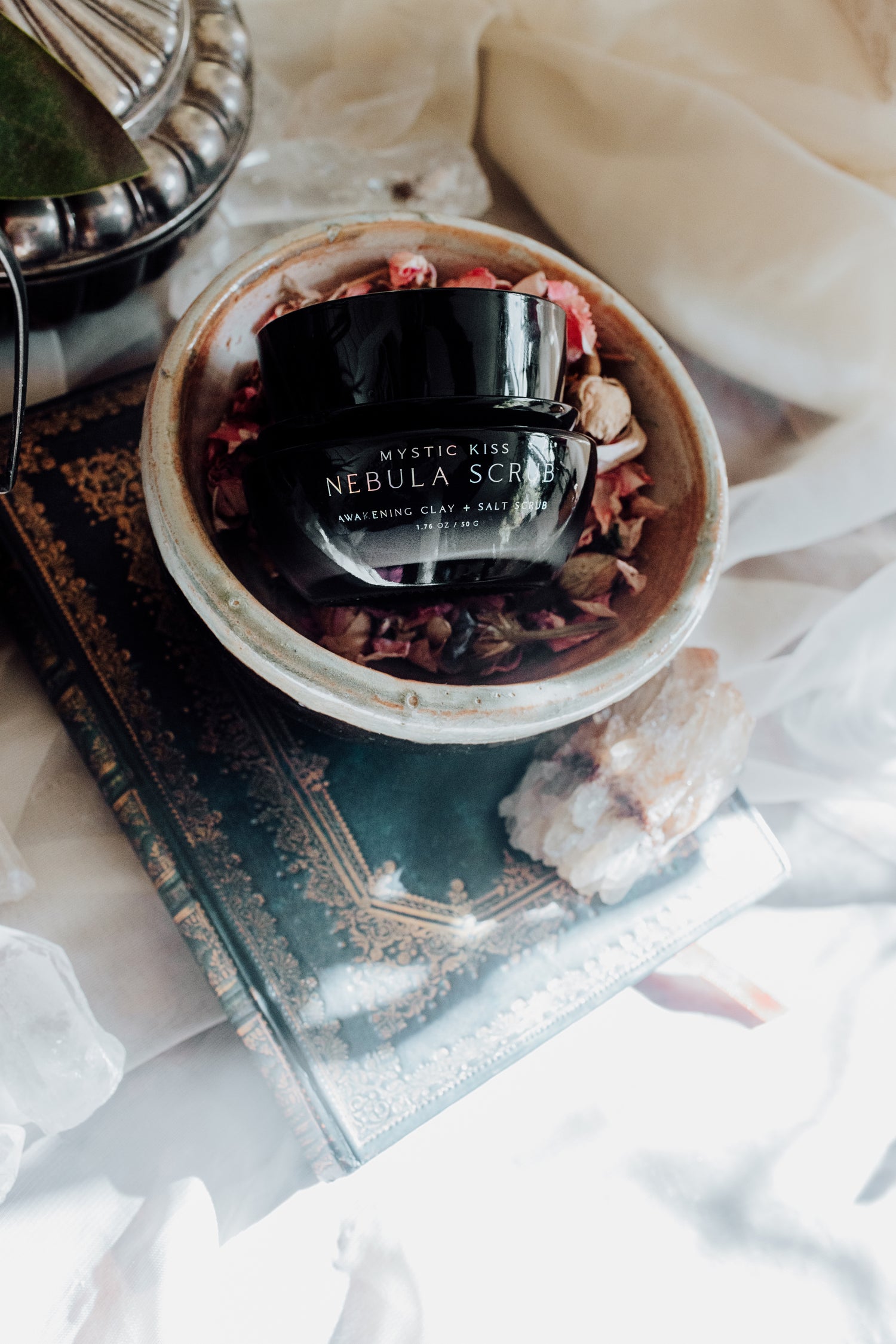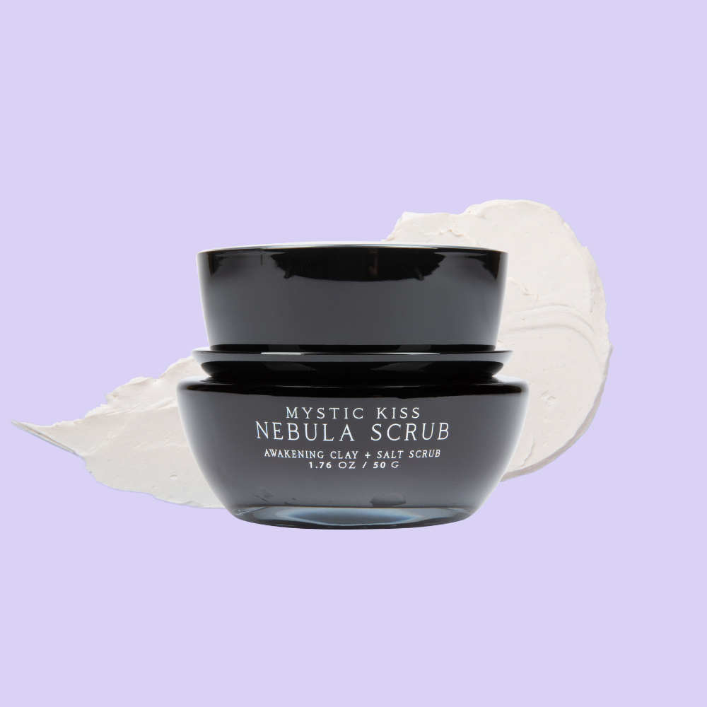 Wet your skin with warm water and feel your pores begin to relax and expand. Dip a generous amount of Nebula Scrub out of the jar with your fingertips. With both hands, gently rub the Nebula scrub into your skin, in soft, circular patterns. Massage your skin in each area for a few moments, ensuring the scrub absorbs deep into your pores.