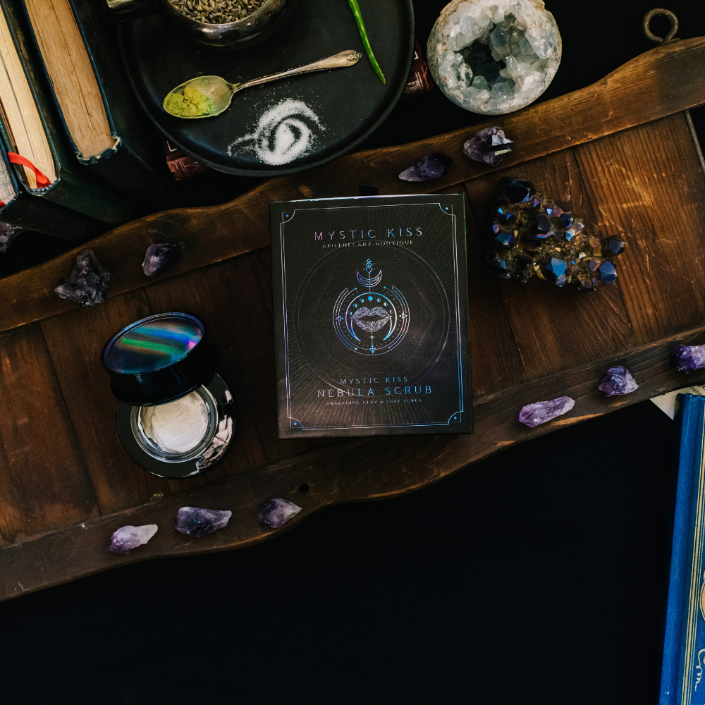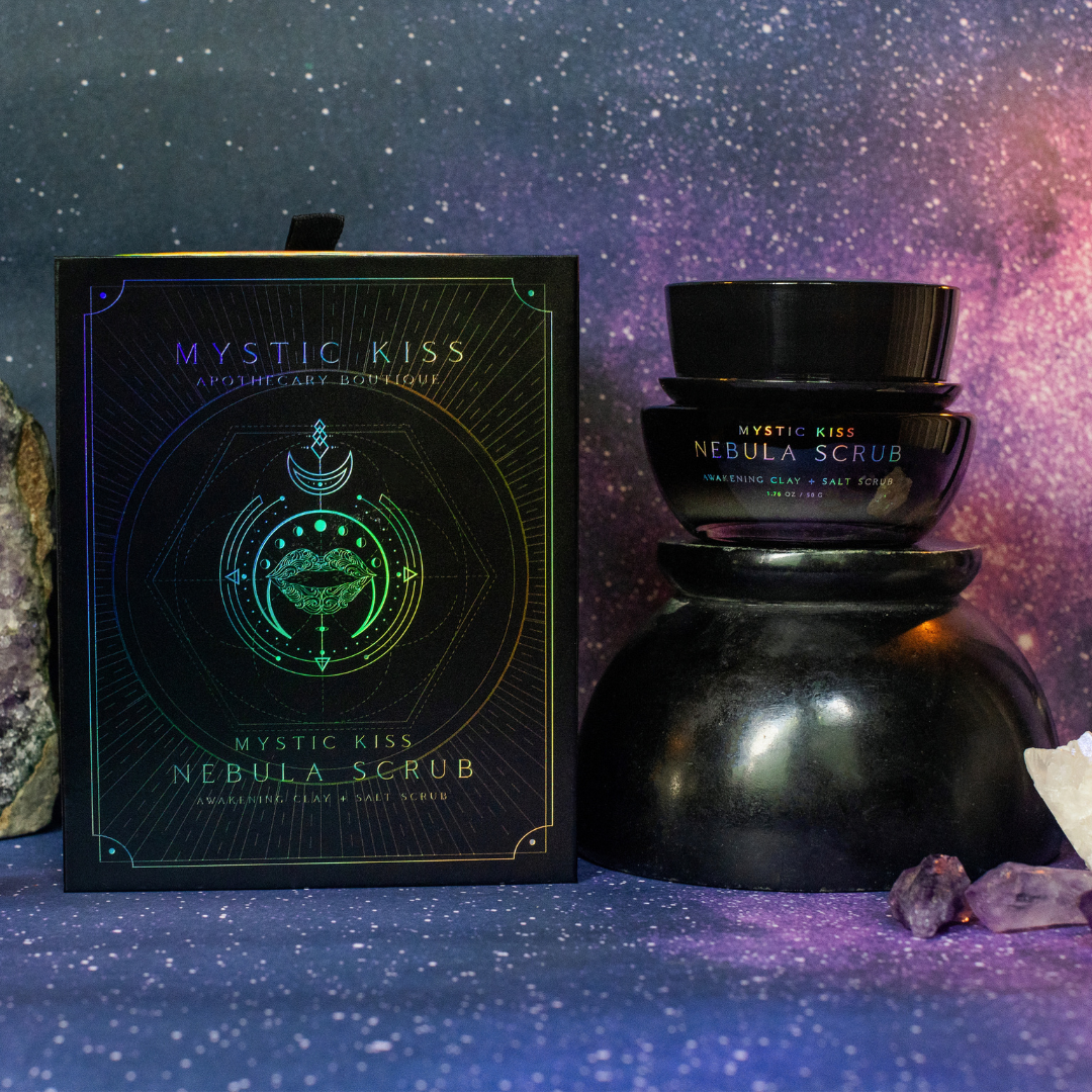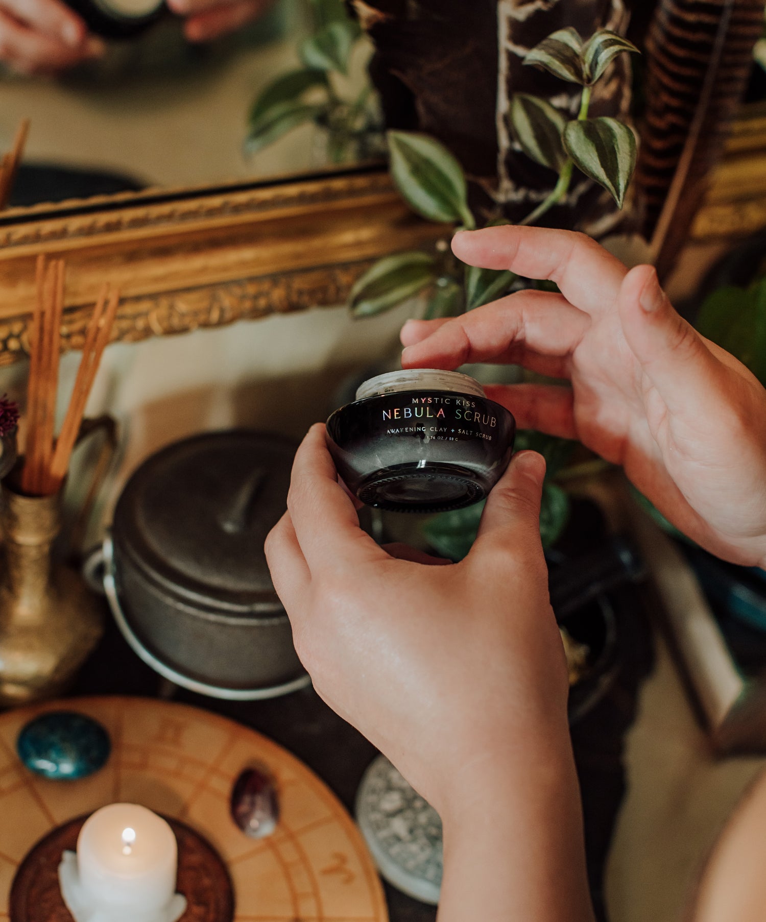 Wet your skin with warm water and feel your pores begin to relax and expand. Dip a generous amount of Nebula Scrub out of the jar with your fingertips. With both hands, gently rub the Nebula scrub into your skin, in soft, circular patterns. Massage your skin in each area for a few moments, ensuring the scrub absorbs deep into your pores.