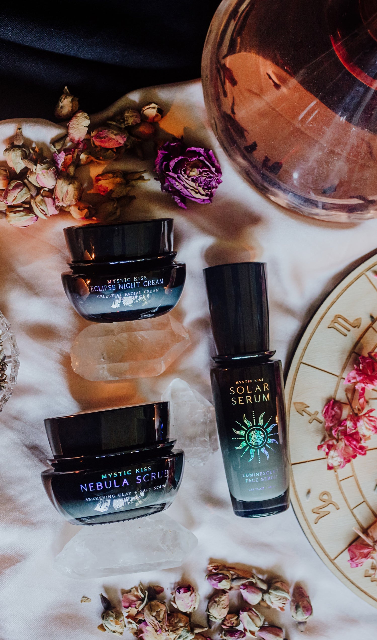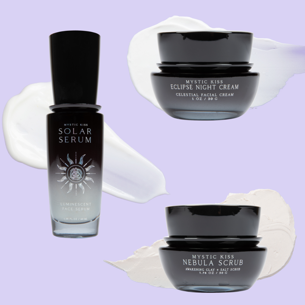 Unlock the secret to ageless beauty with the Youthful Radiance Ritual Bundle from Mystic Kiss. This trio includes the Solar Serum, Eclipse Night Cream, and Nebula Scrub, each expertly formulated to enhance, nourish, and rejuvenate your skin for a timeless glow.